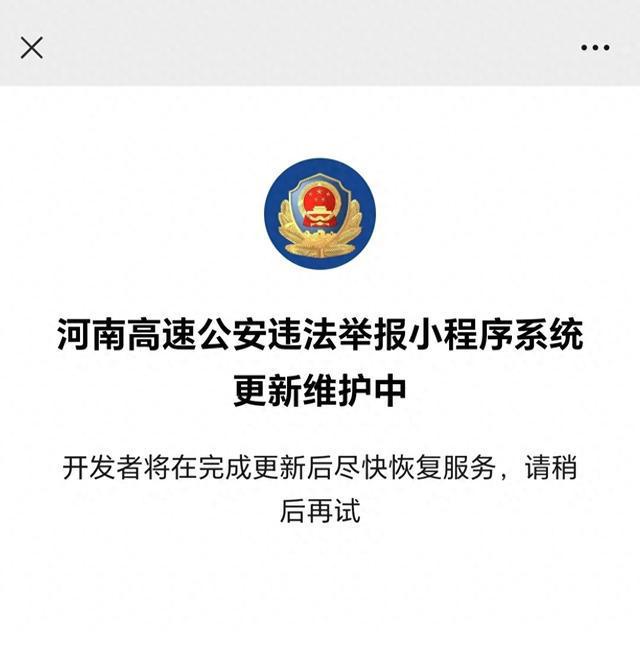 大象新闻·河南交通广播记者 李鹏记者从河南高速交警处获悉,因河南高速公安违法举报微信小程序系统维护,广大群众举报河南省内高速公路交通违法行为可通过报警电话0371-68208110或邮箱“hngsjj123456@163.com”进行提交,敬请谅解!