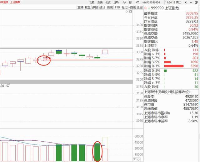 从今天的走势来看,上证越级跳空(直接跳过节前最后一天的收盘阴顶)高开高走,分时呈现健康的价涨量跟的态势,再次逼近4月3日的跳空缺口3313点,下午就要看这个前期跳空缺口的压力能否一举突破。这样看来,节后最后一天量能放大,应该是聪明的资金抄底抢筹所为。
