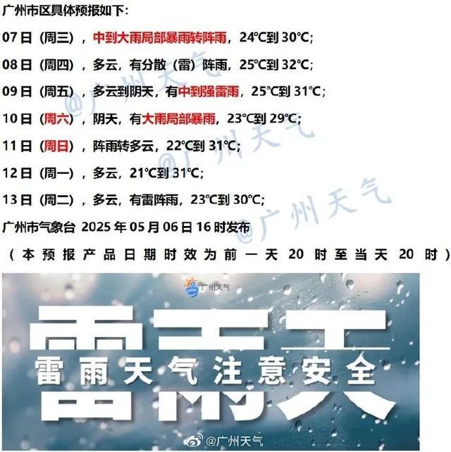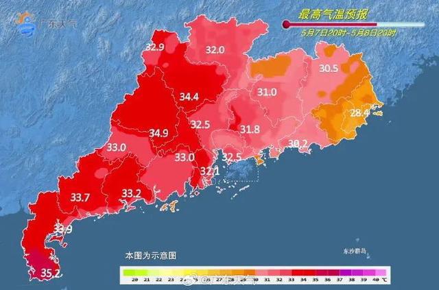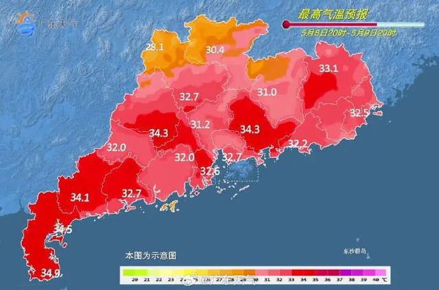 8日夜间-9日白天,中北部市县雷阵雨转大雨到暴雨,局部大暴雨,其余市县多云转中雷雨局部暴雨。最高气温:粤北偏北市县25~28℃,粤西市县32~34℃,其余市县28~32℃。