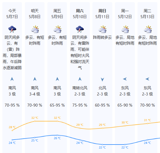 7日-8日白天,中北部市县阴天到多云,有中雷雨局部大雨或暴雨转雷阵雨,其余市县多云到阴天有分散(雷)阵雨。最高气温:我省东部偏东市县28~31℃,其余大部分市县31~34℃。