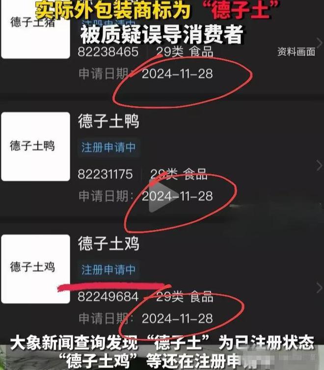 网友们顺藤摸瓜一查,发现“德子土”这个商标早在2023年就申请注册了,而且已经通过审核。而“德子土鸡”“德子土鸭”“德子土猪”这些商标,都是2024年11月28日才申请的,现在还在审核中呢。说白了,商家现在卖的“德子土鸡”,真正的注册商标就只有“德子土”,后面的“鸡”不过是商品名称,可这包装上的字体大小、排版位置,明摆着是想让消费者误以为“德子土鸡”是整个商标,这不就是误导人吗?