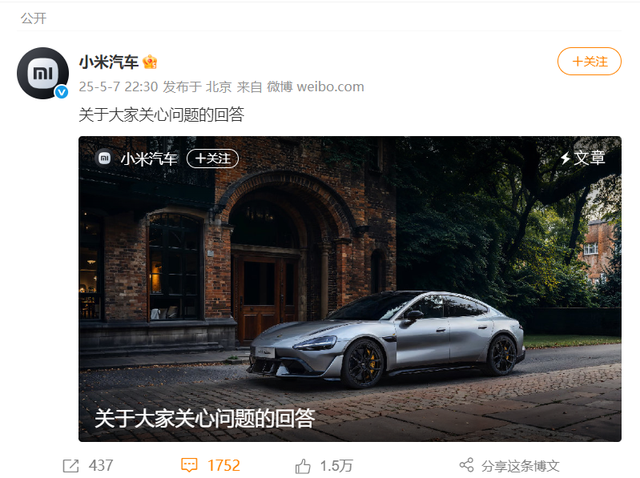 5月7日深夜,小米汽车就此问题在《关于大家关心问题的回答》中发文回应:确实存在不妥,已暂停了这次推送,我们深表歉意。“小米汽车”相关话题冲上热搜第一。