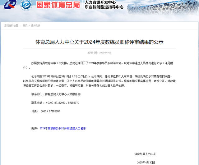 《关于2024年度教练员职称评审结果的公示》