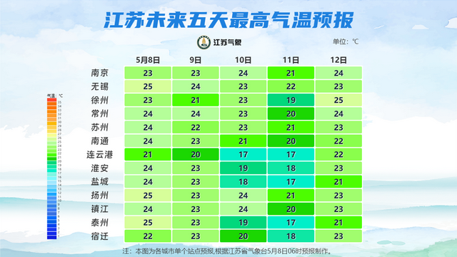 最高温度:本省东北部地区19~20℃,其他地区23~24℃;最低温度:淮北地区12℃左右,沿江和苏南地区17~18℃,其他地区15℃左右。淮河以南地区偏西风,其他地区偏北风转偏西风,风力都是5级阵风6-7级,有雷雨地区雷雨时短时阵风8-9级。