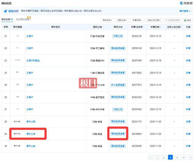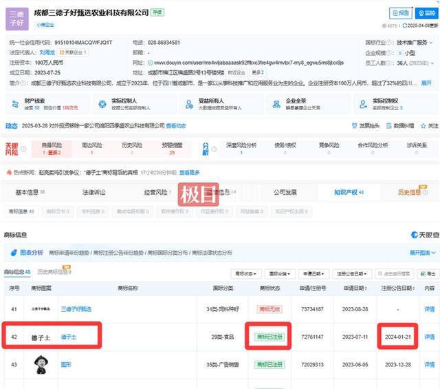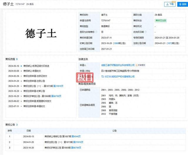 5月8日,极目新闻记者查询发现,成都三德子好甄选农业科技有限公司商标信息中,曾申请了“三德子好甄选”“德子土”“德子土鸡”等商标,其中“德子土”显示已注册,“德子土鸡”还在等待实质审查。在“德子土”商标的商品/服务类项目里,已申请的商品/服务包括:鸡肉、肉、腌制肉、家禽(非活)、蛋等。