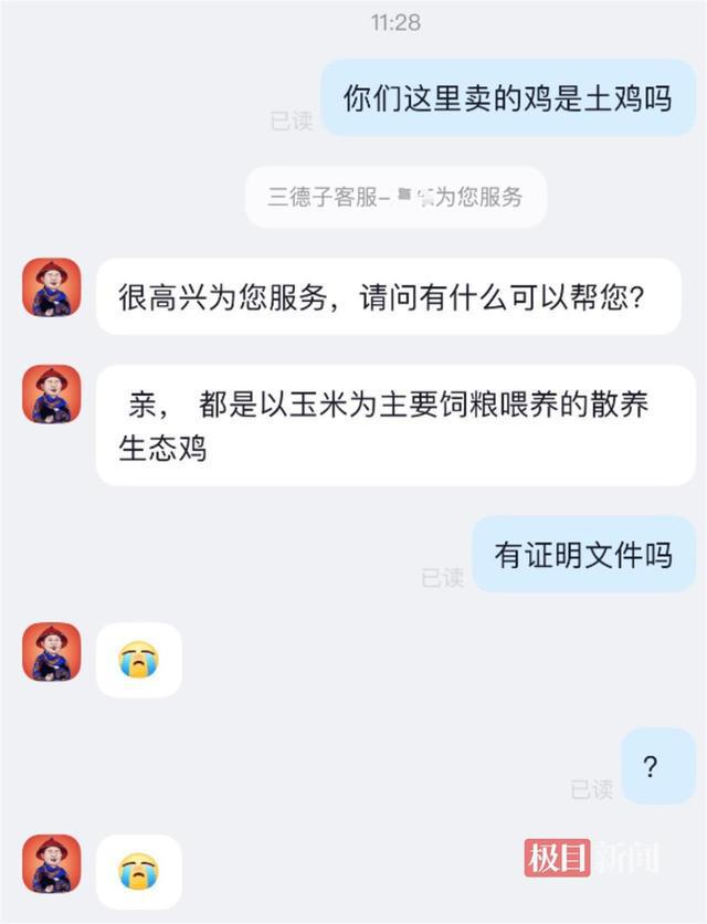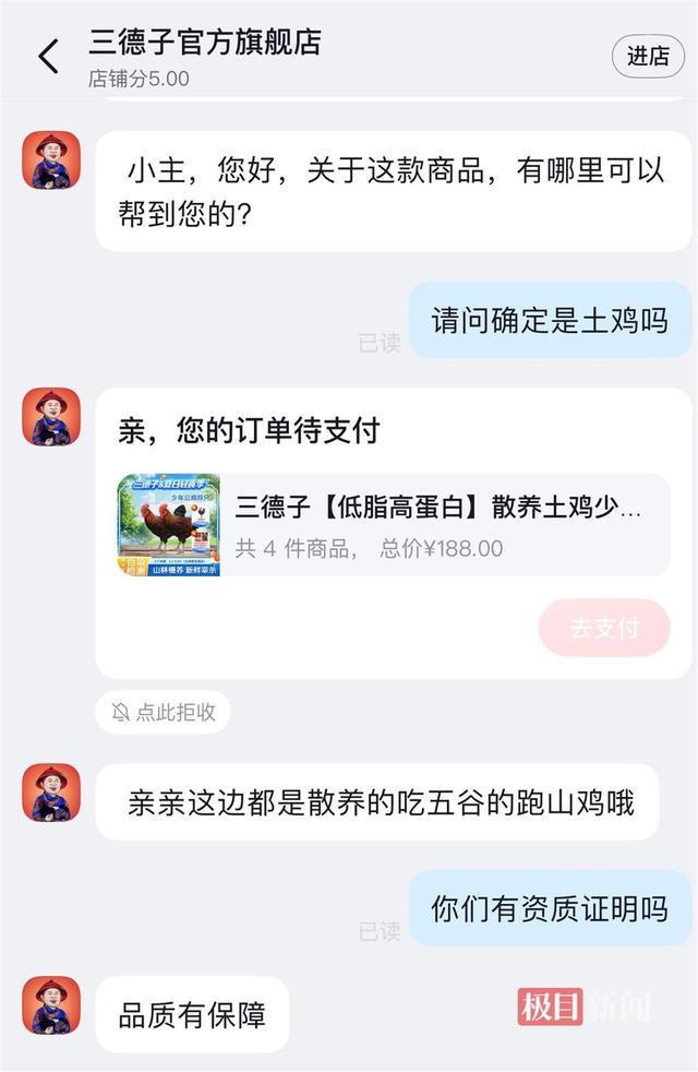 极目新闻记者也致电成都三德子好甄选农业科技有限公司,但未能接通。随后,记者在三德子官方旗舰店询问客服店内售卖的产品是否为“土鸡”,客服回复称“这边都是散养的吃五谷的跑山鸡”。记者追问是否有资质证明文件,客服回复“品质有保障”,但未给出文件证明。
