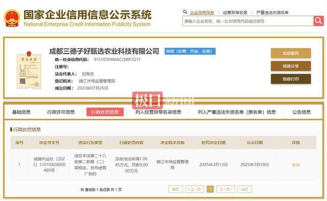 另据国家企业信用信息公示系统网站,成都三德子好甄选农业科技有限公司在2025年3月13日曾被四川省成都市锦江区市场监督管理局作出行政处罚,违法行为类型是违反《中华人民共和国广告法》第二十八条第二款第(二)项规定,发布虚假广告,行政处罚为没收违法所得1.0045万元,罚款9万元。