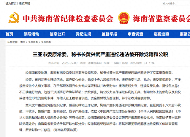 5月9日,据海南省纪委监委通报,经海南省委批准,海南省纪委监委对三亚市委原常委、秘书长黄兴武严重违纪违法问题进行了立案审查调查。