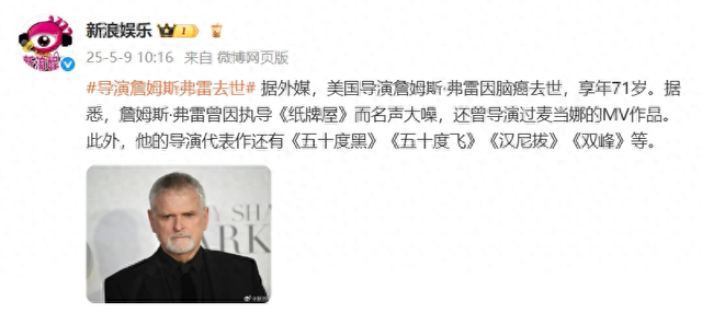 著名导演因脑癌去世 曾执导《纸牌屋》《汉尼拔》