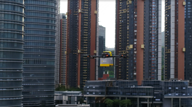▲美团无人机正在城市复杂场景中进行配送(管乐 摄)