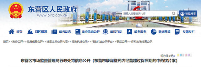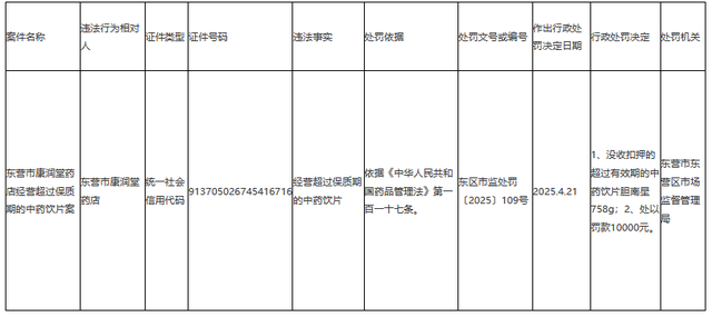 近日,东营市东营区市场监督管理局公布行政处罚信息,东营市康润堂药店因经营超过保质期的中药饮片被罚10000元。