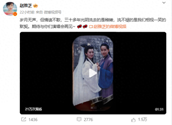 5月10日,演员赵雅芝在社交平台发布视频并配文:“岁月无声,但情谊不散,三十多年光阴洗去的是稚嫩,洗不褪的是我们相视一笑的默契。期待与你们演唱会再见~。”