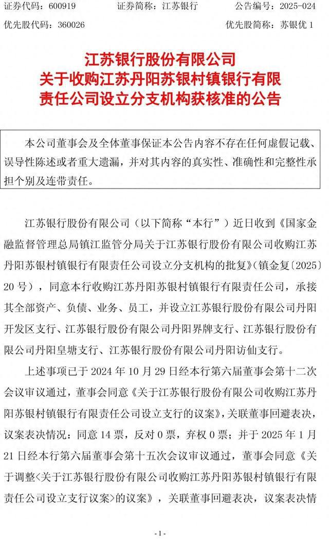 近日,江苏银行发布公告称,该行近日收到《国家金融监督管理总局镇江监管分局关于江苏银行股份有限公司收购江苏丹阳苏银村镇银行有限责任公司设立分支机构的批复》。