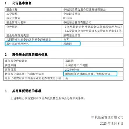 近日,中航基金一起人事变动引发金融圈热议,邓海清卸任中航混改精选(004936)基金经理一职,转而由方岑单独管理,他本人则继续担任公司副总经理及首席投资官,但名下已无在管基金。