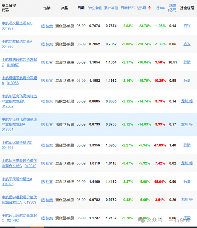 资料显示,中航基金由中国航空工业集团实际控制,是一家中小型基金公司。目前管理规模为375亿,业务以固收类产品为主,债券基金规模超300亿,货币基金30亿,而股票基金和混合基金规模相对较小。公司旗下权益基金表现分化严重,除中航趋势领航混合这只机器人基金近6个月盈利超60%外,其他权益基金大多亏损。中航混改精选便是近半年表现最差的基金之一,此外,中航机遇领航混合跌了16%,中航华证商飞高端跌近15%。