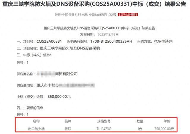 据中国政府采购网2025年5月9日发布的《重庆三峡学院防火墙及DNS设备采购(CQS25A00331)中标(成交)结果公告》显示,主要标的信息中,出口防火墙一栏,显示采购产品为1台“普联TL-R473G”,其单价为75万元。中标信息则显示,供应商为重庆丰都县某商贸有限公司。