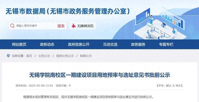 5月8日,无锡学院南校区一期建设项目用地预审与选址意见书批前公示发布。