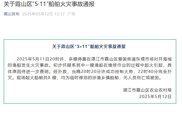 湛江市霞山区农业农村局5月12日通报:2025年5月11日20时许,多艘停靠在湛江市霞山区爱国街道东堤市场对开海域的渔船发生火灾事故。初步怀疑系其中一艘渔船在维修作业的过程中起火引起,具体原因待进一步查明。