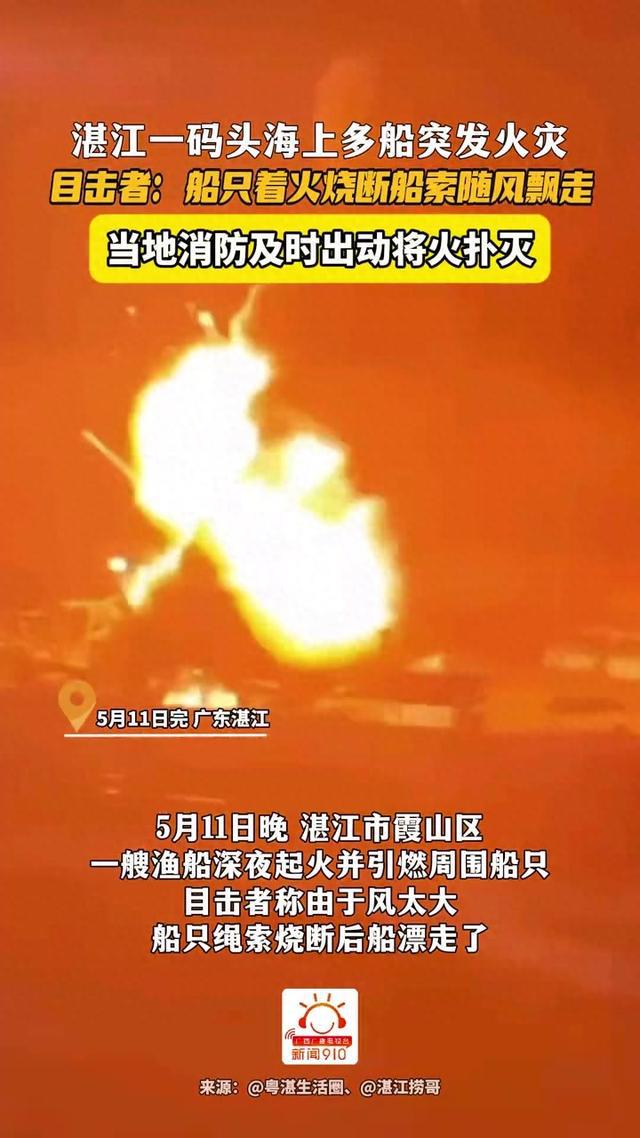 5月11日晚,湛江市霞山区一艘渔船深夜起火并引燃周围船只,目击者称由于风太大,船只绳索烧断后船漂走了。经消防处置,火势当晚已被成功扑灭。