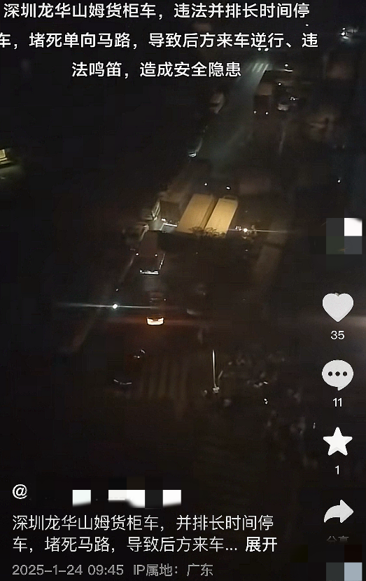 据该网友反映,其所居住的壹成中心小区毗邻山姆会员店(龙华店)货仓,该商超大型货柜车常于夜间22:00至次日早上7:00进出送货。由于货柜车体型较大且多车次并行,常需在泓光路往东环一路方向临时停靠排队卸货,致使该路段形成交通瓶颈。后方受阻车辆频繁鸣笛催促,持续产生的噪声严重干扰周边居民夜间休息。此外,货柜车经过时发出的轰鸣声和气刹声,也给附近居民带来不小困扰。