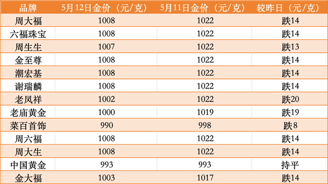 黄金遭到“砸盘”。与此同时,国内金饰价格跟跌,周六福、周大生等多品牌足金金饰价格一夜大跌14元/克。其中,老庙黄金报1000元/克,较前一日的1019元/克,下跌19元/克,老凤祥报1002元/克,较前一日的1022元/克,下跌20元/克。盘古智库高级研究员余丰慧在接受时代周报记者采访时表示,“中美贸易关系的缓和确实降低了市场的避险需求,这对黄金的价格产生了一定的压力。本轮金价回调可以视为短期波动,因为贸易紧张局势虽然有所缓解,但全球经济环境仍存在诸多不确定性因素。当前的金价已经部分反映了市场对贸易风险缓解的预期,但是考虑到美联储货币政策的变动和其他地缘政治因素,金价仍有进一步调整的空间。”5月12日,黄金市场遭遇“黑色星期一”。COMEX黄金期货主力合约同样表现低迷。该合约于5月12日低开近2%,随后震荡下行,日内最低触及3222.2美元/盎司。截至发稿,COMEX黄金期货主力报3230.9美元/盎司,跌幅3.38%。A股黄金珠宝板块当日低开低走,截至收盘,潮宏基跌幅4.41%,西部黄金、四川黄金跌幅超3%,山东黄金、山金国际跌幅超2%,板块整体下跌1.22%。黄金相关ETF纷纷回调,截至收盘,黄金ETF华夏(518850)、中银上海金ETF(518890)、上海金ETF(159830)等多只黄金ETF跌逾2%。中国投资协会上市公司投资专业委员会副会长支培元向时代周报记者表示,本轮金价回调更倾向于是短期波动而非趋势性转折。一方面,全球经济仍面临诸多不确定性,如地缘政治冲突、部分地区经济复苏乏力等,这些因素随时可能引发市场动荡,重新激发对黄金的避险需求。另一方面,虽然中美贸易取得进展,但贸易关系的长期稳定性仍有待观察,未来仍可能出现波折。金饰价格最高下跌20元/克截至目前,周六福、周大生、周大福、六福珠宝、金至尊、潮宏基、谢瑞麟报1008元/克,周生生报1007元/克,老凤祥报1002元/克,老庙黄金报1000元/克,菜百首饰报990元/克;中国黄金报993元/克,与昨日持平。展望下半年,余丰慧表示,黄金走势将受制于美联储降息预期延后及地缘政治不确定性的双重影响,预计黄金价格将呈现出震荡格局。投资者可关注美国经济数据的变化、美联储政策声明以及全球地缘政治局势的发展,这些因素将会对黄金价格产生重要影响;同时,注意观察美元指数的动向,这也是影响黄金价格的一个重要因素。