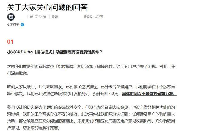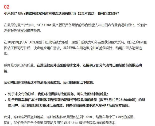 面对汹涌的舆情,小米汽车5月7号深夜连发两次道歉,承认“排位模式”解锁条件变更和前舱盖功能表述不清,还说给未交付车主提供改配服务,已提车的送2万积分。可这波操作在车主看来,更像“隔靴搔痒”。你说功能表述不清?但宣传时雷军直播里信誓旦旦“双风道直接导向轮毂”,实车却连基本导流功能都没有,这不是虚假宣传是什么?你说送积分补偿?4.2万的选装件货不对板,两万积分满打满算也就200块钱,这诚意明显不够。