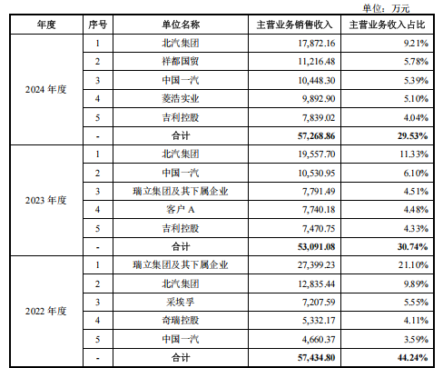 2022年至2024年,瑞立科密向同一控制下的前五大客户销售金额分别为57,434.80万元、