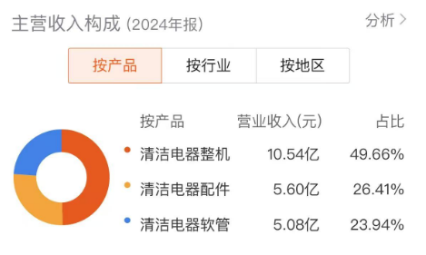 据了解,整机业务是春光科技的重要业务之一,2024年清洁电器整机产品为公司带来10.54亿元收入,同比增长16.74%;营收占比达到49.66%,是公司目前最大的收入来源。核心产品的稳健增长,将构成公司业绩持续增长的坚实基础。