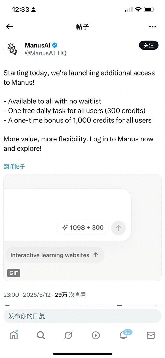 AI智能体平台Manus宣布面向全球用户开放注册。Manus日前在社交平台发布消息称,从5月12日起,Manus向所有人开放,无需等待名单;所有用户每天可免费执行一项任务,消耗300积分,所有用户一次性获得1000积分奖励。