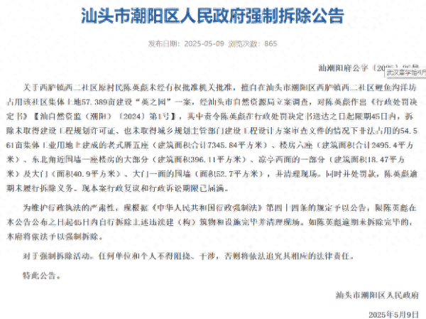 5月13日,大皖新闻记者查询到,广东省汕头市潮阳区人民政府于5月9日发布了一则强制拆除公告,被强拆的对象系“英之园”,称此建筑系村民陈某彪非法占用集体工业土地违建住房十余座,占地面积54.561亩。5月13日,汕头市潮阳区西胪镇镇政府工作人员告诉大皖新闻记者,“这件事是真实的,我们当地在处置。”当记者询问“英之园”是否如网传所说“耗资10个亿”,镇政府工作人员回应称,无法提供相关信息。