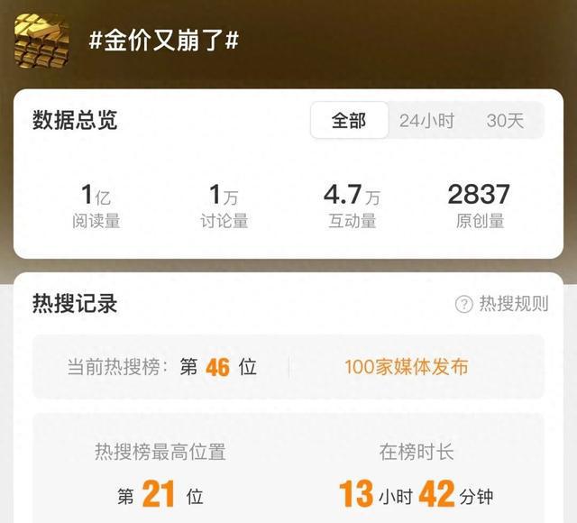“金价又崩了”话题冲上热搜