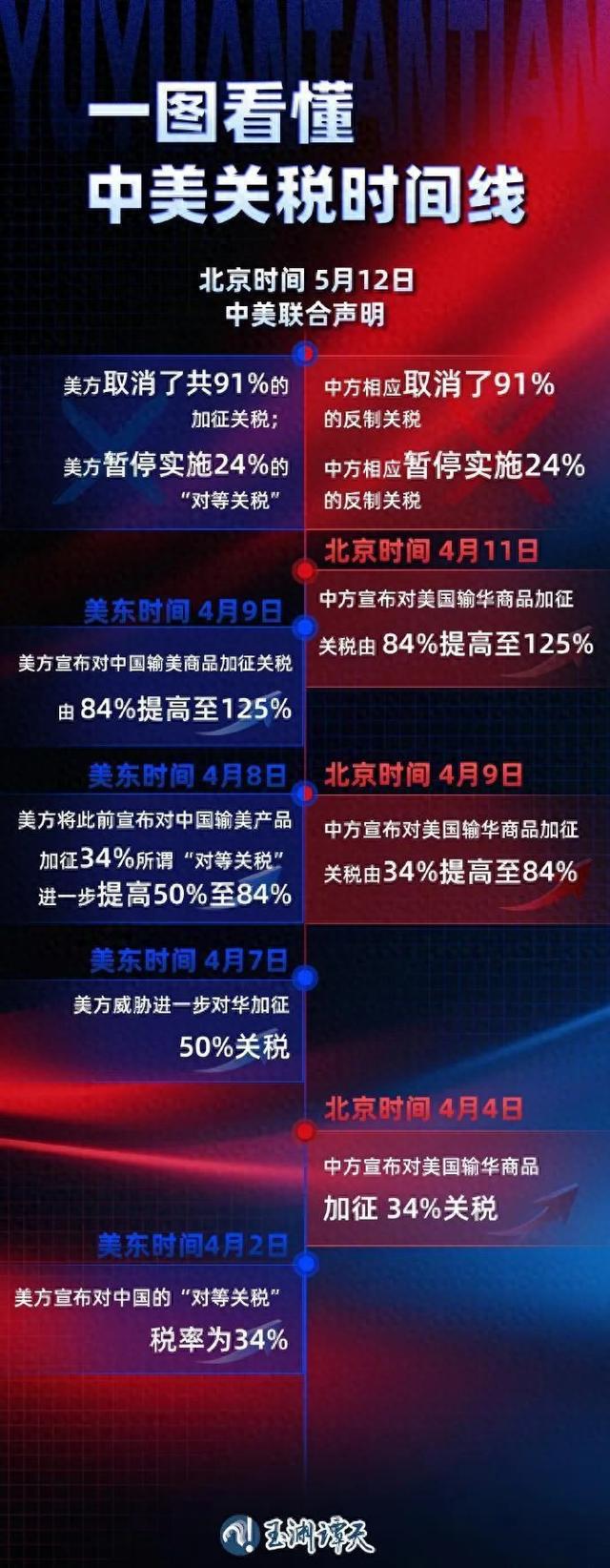 当地时间5月12日,中美日内瓦经贸会谈联合声明发布,双方大幅降低双边关税水平,这一举措符合两国生产者和消费者的期待,也符合两国利益和世界共同利益。关税是如何变化的,一图看懂。