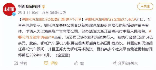 当前,该公司已多次被列为被执行人,被执行金额已超1.4亿余元。此前,哪吒汽车原CEO张勇被曝离职后身处英国引发热议,其回应称仍然担任哪吒汽车顾问,并且正努力为哪吒寻求融资。目前其多个社交平台最近更新时间停留在2024年10月。
