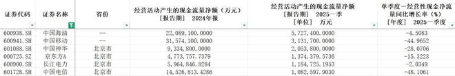 同花顺数据显示,2025年一季度,上市公司经营活动产生的现金流量净额超过100亿元的有17家,分别为中国石油、中国海油、宁德时代、中国移动、中国神华、华能国际、五粮液、中远海控、美的集团、国电电力、京东方A、紫金矿业、TCL科技、长江电力、格力电器、中国电信、金龙鱼。