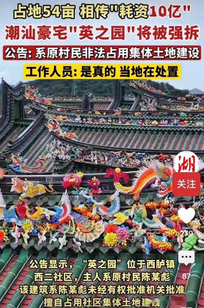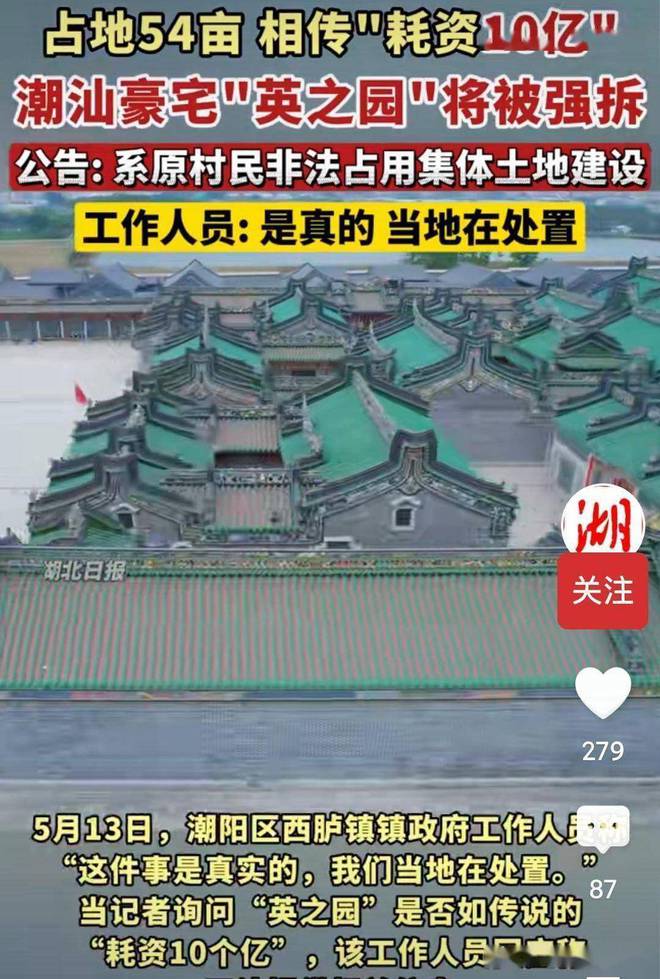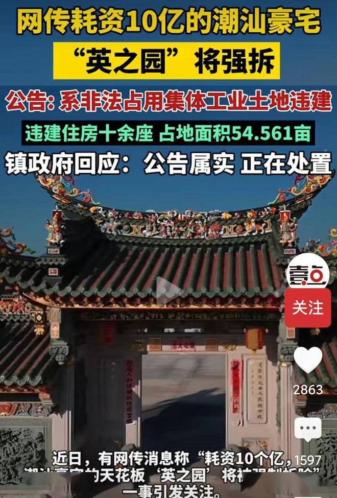 耗资10亿的潮汕豪宅“英之园”将强拆,背后老板曝出,身份不简单