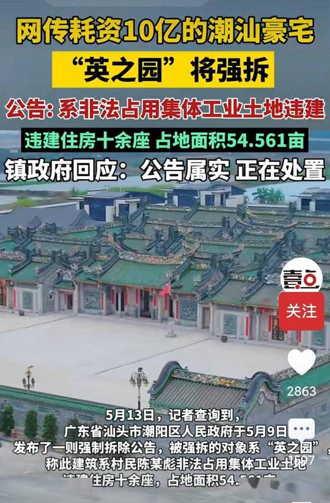 5月13日,网上传得沸沸扬扬,说潮汕有个花了10个小目标打造的豪宅“英之园”要被强制拆除了。这事儿刚冒出来,就跟扔下一颗炸弹似的,好多人都凑过来看热闹,毕竟10亿建的房子说拆就拆,搁谁眼里都是大事儿。