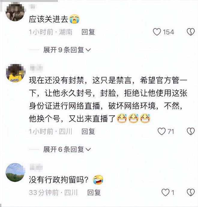 由于胡同串子的言论“出格”,因此,其账号被平台封禁,但他的账号被封之后,他却在粉丝群里喊起了冤。说自己没提“汶川地震”四个字,只是说“四川网友”,还说这事是去年11月的,现在被翻旧账,肯定是有人故意整他,甚至放话要走法律途径,坚决不退网。嘿,您猜网友怎么回他的?“没提地震字眼就不伤人了?‘埋了’俩字跟地震啥关系,心里没数吗?”