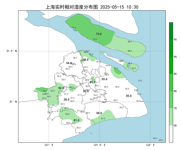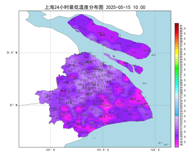 气温不低,早间大部分地区最低气温在18~22℃之间,市区徐家汇站22.3℃,预计最高气温30℃。气温偏高、湿度大,体感有些闷热、不太舒适。