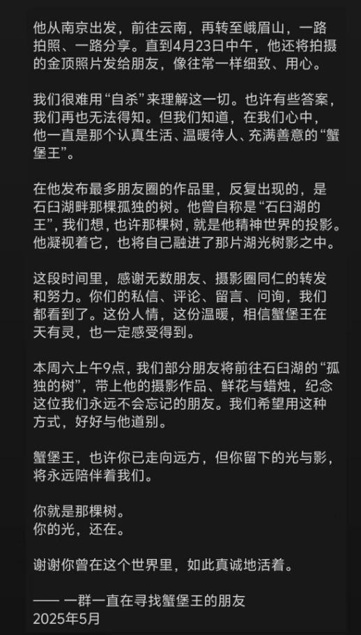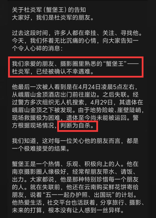最近几天,不少关注峨眉山失联事件的人心里都沉甸甸的。那个独自背着相机走遍山川的年轻摄影师“蟹堡王”,终究还是没能等到奇迹。5月15日晚上,他的朋友在社交平台发布讣告,说4月29日在峨眉山金顶下方发现了他的遗体,这个总爱用镜头记录美好风景的大男孩,永远停在了29岁。