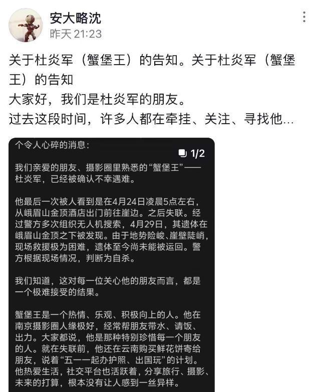 据朋友回忆,杜炎军是从南京出发的,先去了云南,又辗转到峨眉山,一路上都在拍照分享。4月23日他还发了金顶的照片给朋友,修图时还特意叮嘱“云的层次要再调调”,语气跟往常没什么两样。谁能想到,这个总说“镜头里的世界比现实温柔”的人,会选择从那样陡峭的崖壁上离开?