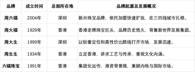 对比来看,周大福和周生生拥有近百年品牌历史,算得上是行业老大哥;总部位于深圳的周大生和周六福成立时间不足30年,资历不算太老。