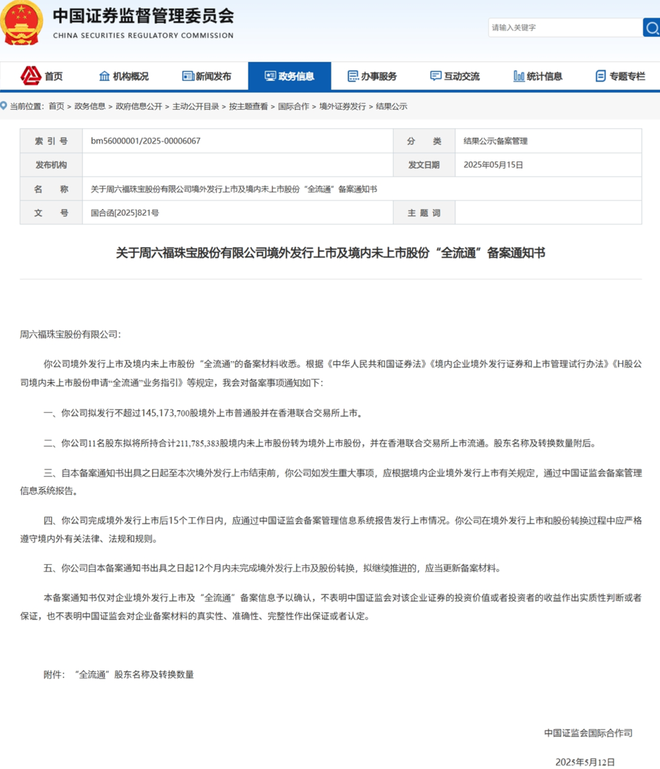 5月15日,中国证监会发布 关于周六福珠宝股份有限公司境外发行上市及境内未上市股份“全流通”备案通知书。