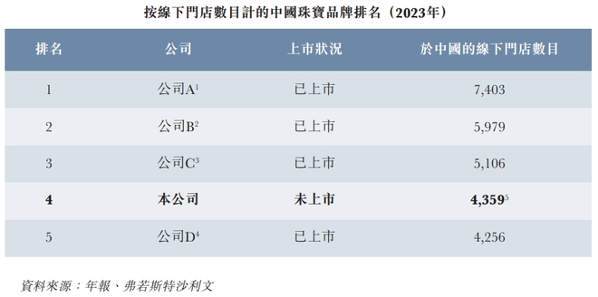 截至2023年12月31日止年度,按中国线下门店数目计,周六福在中国所有珠宝品牌中排名第四,有4359家。