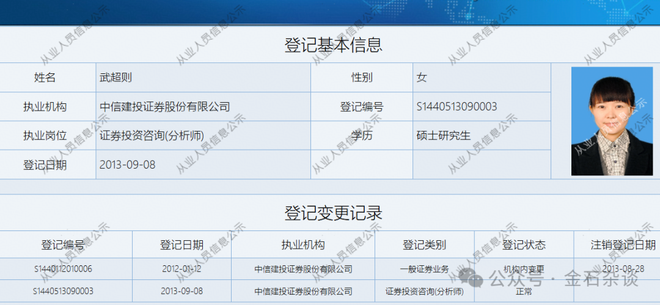 不过,金石杂谈查询协会信息,武超则自从2012年加入中信建投就一直在中信建投工作,一干就是13年,可以说是中信建投中的老人了,这和目前各大券商分析师或研究所所长频繁跳动形成了鲜明对比。