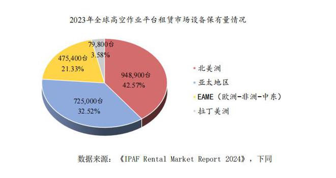 浙江鼎力所属的高空作业平台行业,国内市场起步较晚,且新兴市场处于发展初期,市场规模较小。从全球范围内来看,美国高空作业平台保有量增长趋势明显,欧洲十国高空作业平台保有量增长稳定。根据《IPAF Rental Market Report 2024》,2023 年全球高空作业平台租赁市场保有量约223万台。其中北美洲保有量约94.89万台,占比42.57%,亚太地区保有量约72.5万台,占比32.52%。