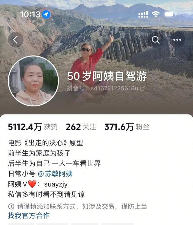 她将自己的经历分享在网络上,意外收获了大量关注,成为拥有几百万粉丝的“自驾游阿姨”。她表示:前半生为家庭为孩子,后半生为自己,一人一车看世界。她的故事鼓舞了无数身处困境的女性。