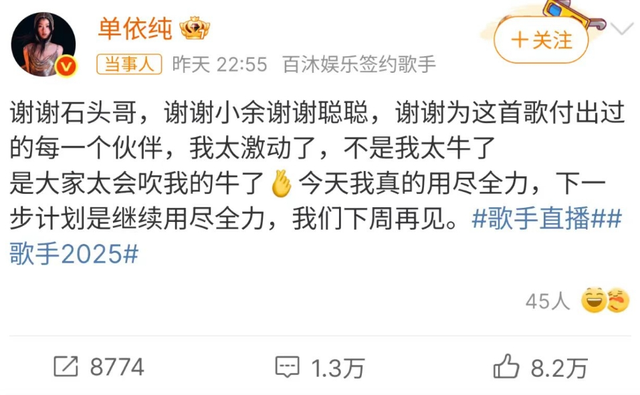 单依纯夺得歌手2025第一期周冠军,随后她发文: