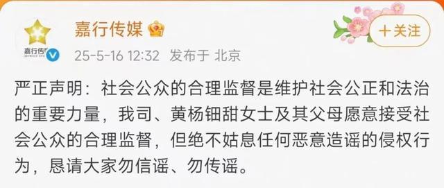 嘉行传媒、黄杨钿甜女士及其父母愿意接受社会公众的合理监督,但绝不姑息任何恶意造谣的侵权行为,恳请大家勿信谣、勿传谣。