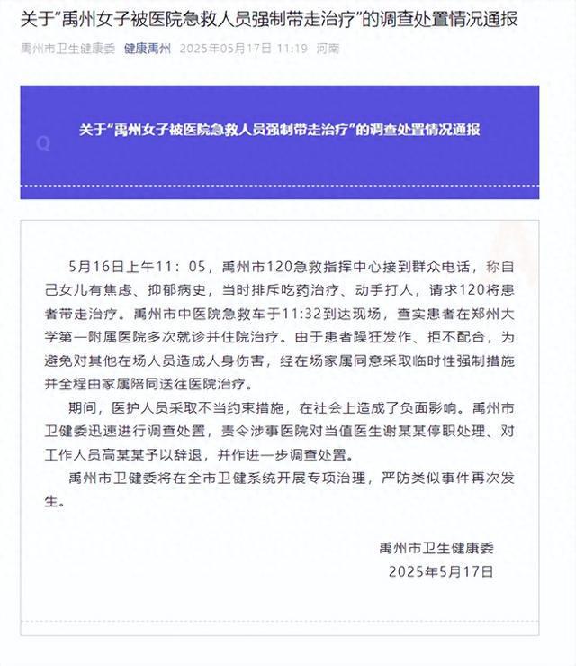 河南禹州市卫生健康委5月17日发布关于“禹州女子被医院急救人员强制带走治疗”的调查处置情况通报。