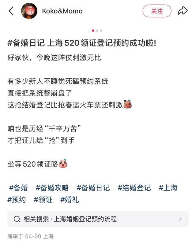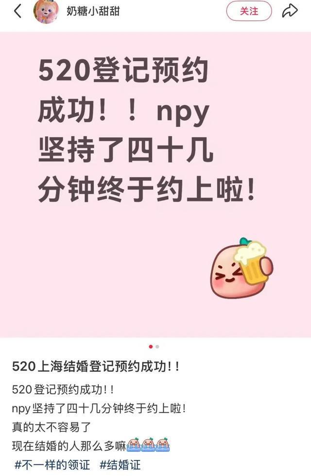 抢到5月20日预约登记的新人也直呼不容易:“直接把系统整崩盘了,这抢结婚登记比抢春运火车票还刺激”。